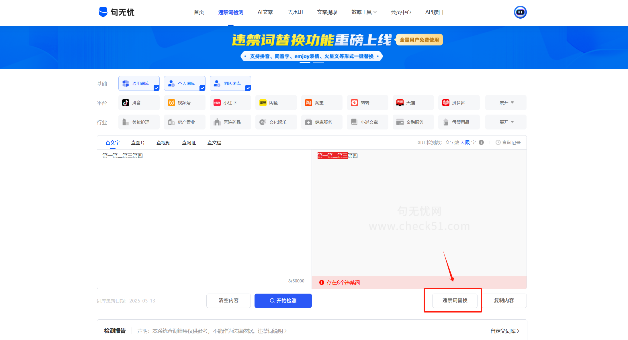 现在,就让我们一起前往句无忧(www.check51.com),体验违禁词一键替换的强大功能吧!如果您对我们的新功能有任何疑问或建议,请随时与我们联系,我们将竭诚为您服务。
