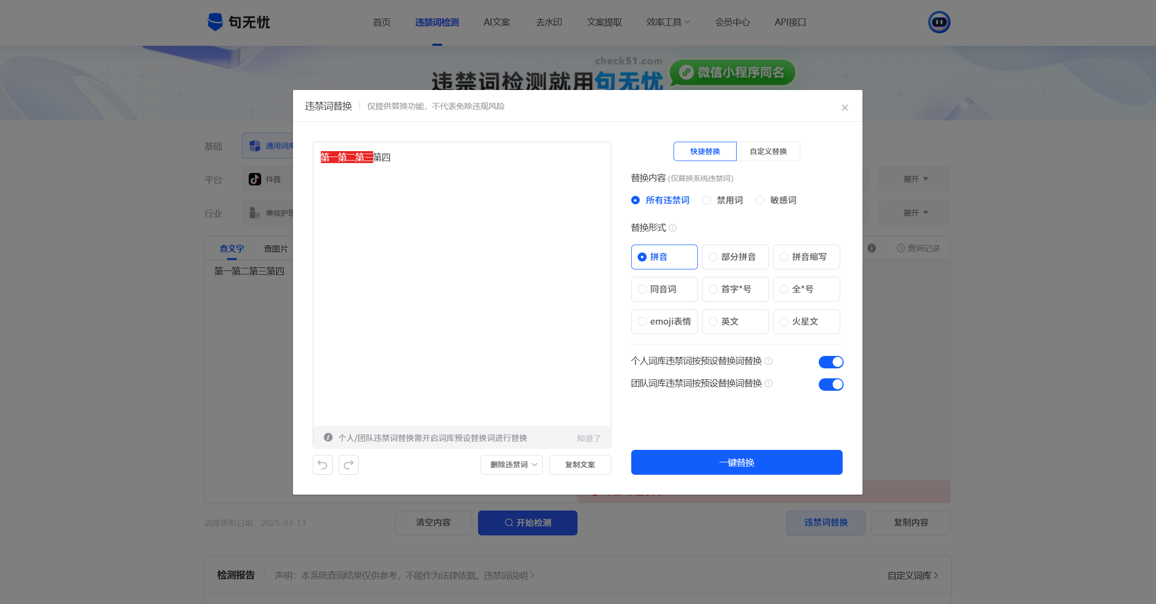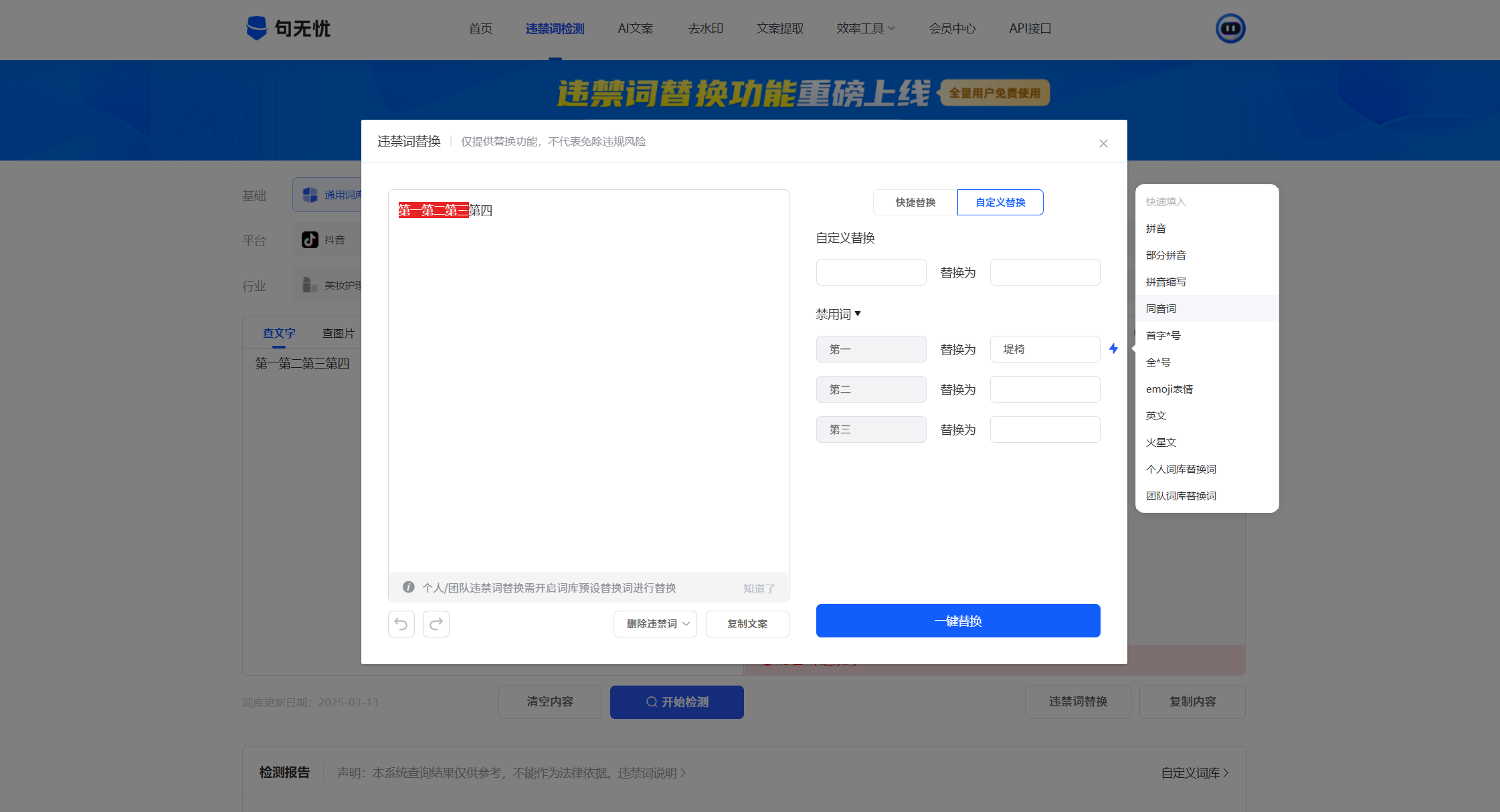 在如今信息传播极为便捷的时代,内容创作与发布已成为大众生活的一部分。无论是自媒体创作者、电商从业者,还是企业宣传人员,在发布内容时都可能面临一个棘手的问题 —— 违禁词。稍有不慎,就可能导致内容审核不通过、账号受到限制等不良后果。为了解决这一痛点,句无忧违禁词检测平台不断创新,如今迎来了重大升级 —— 检测出来的违禁词可以一键替换成拼音、同音词、emoji 表情、火星文、* 号等多种形式!