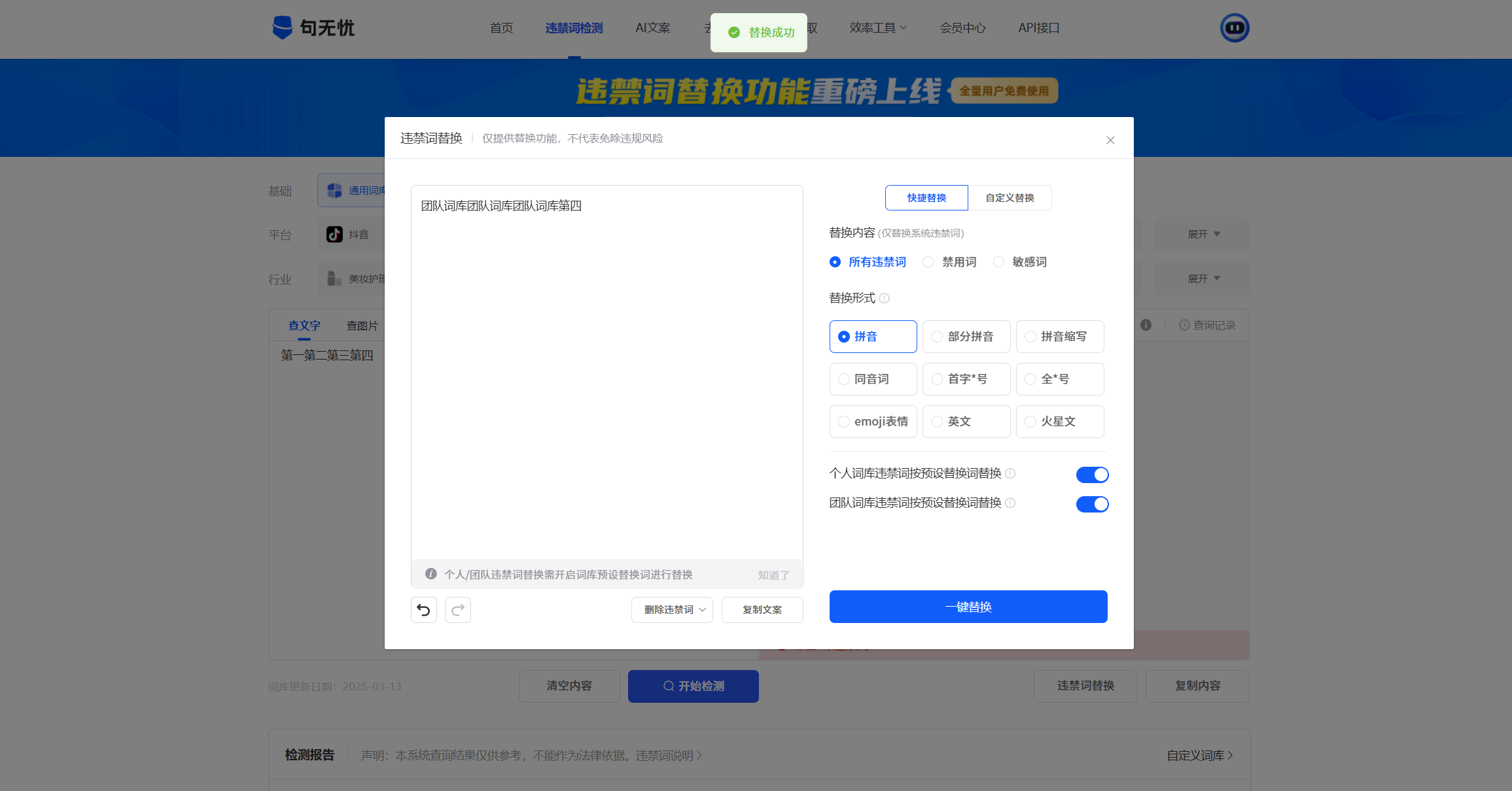 检测中选择了个人词库/团队词库时,若检测出自定义的违禁词,会激活个人/团队词库的替换词替换开关,开启后会优先替换预设好的词库替换词。